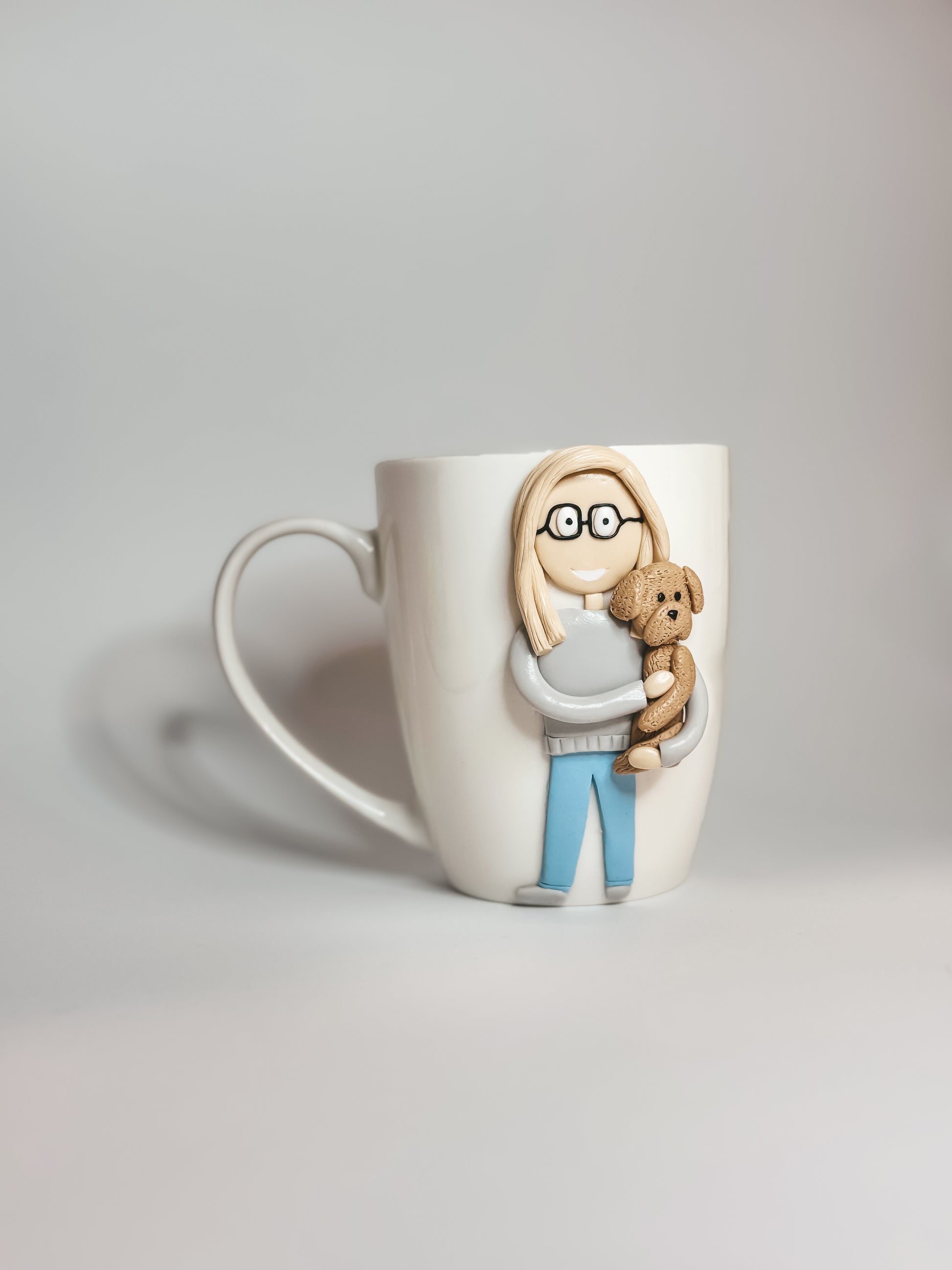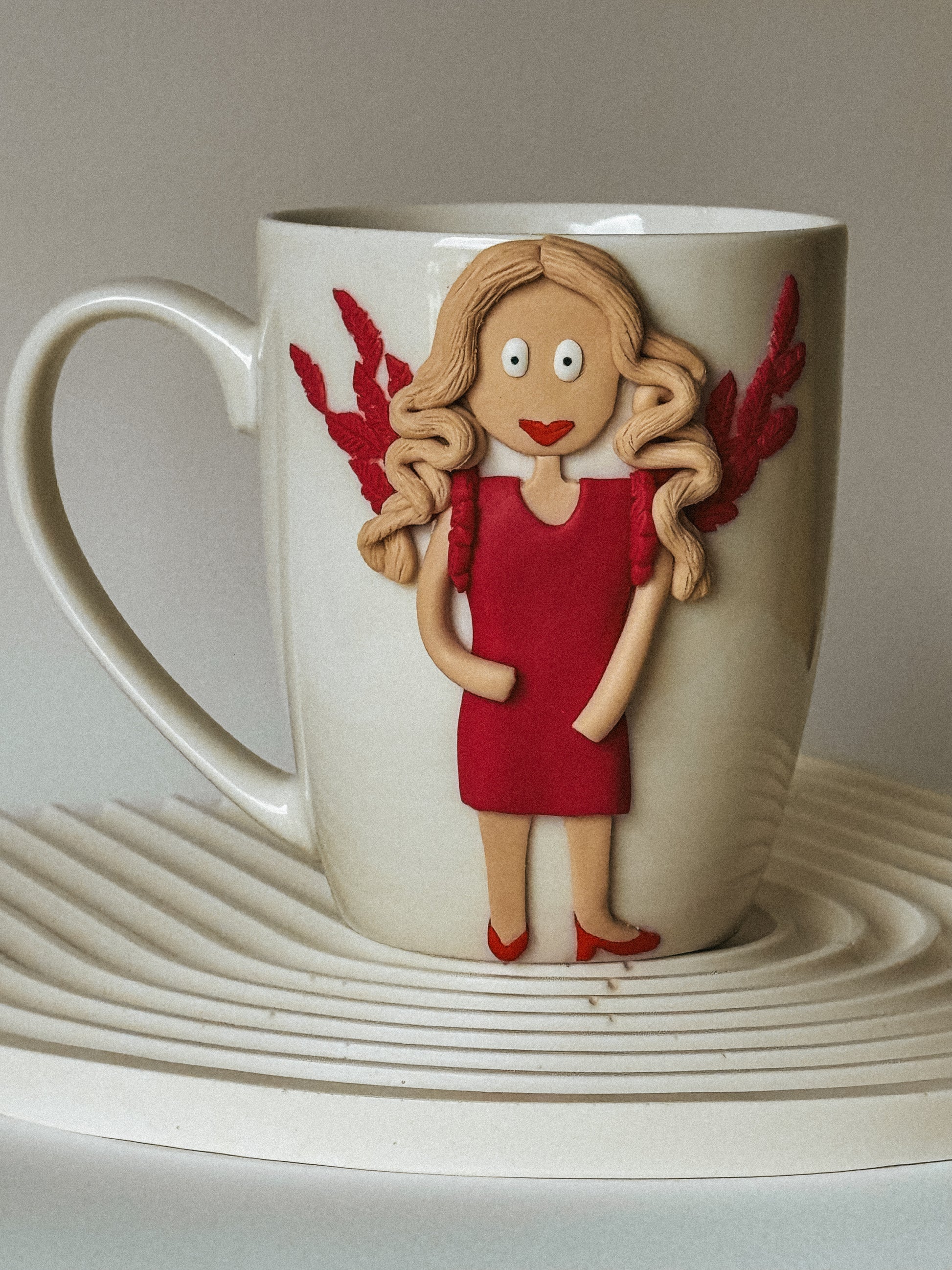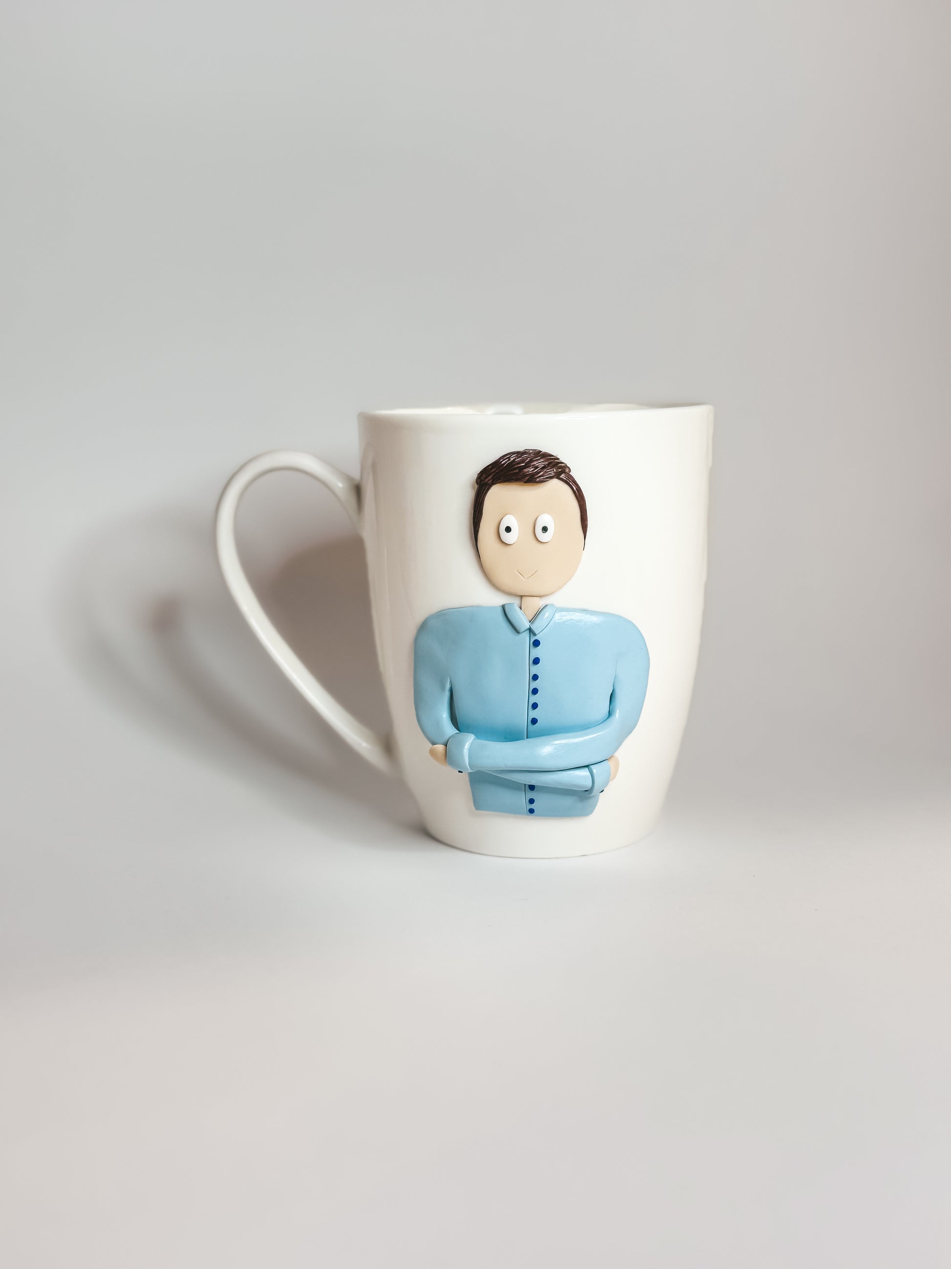 Dekoruotas puodelis pagal individualius užsakymus. Iš polimerinio molio lipdomas ir ant puodelio klijuojamas stilizuotas žmogaus atvaizdas iš atsiųstos nuotraukos. Veido bruožai neatkartojami, tik stiliaus ir aprangos detalės. Puodelį galima naudoti buityje, pilti karštą ar šaltą vandenį. Plauti rankomis, negalima dėti į indaplovę.