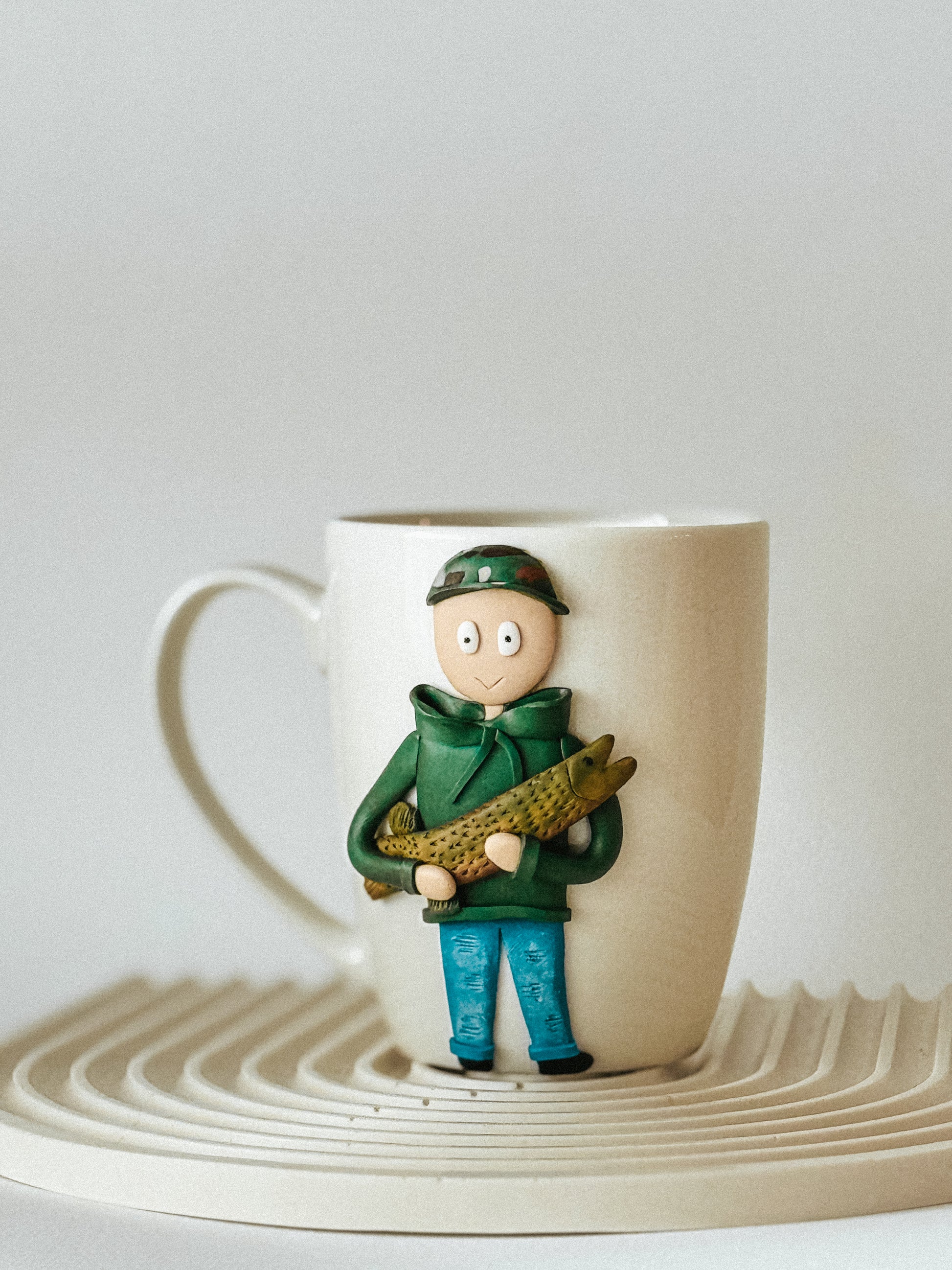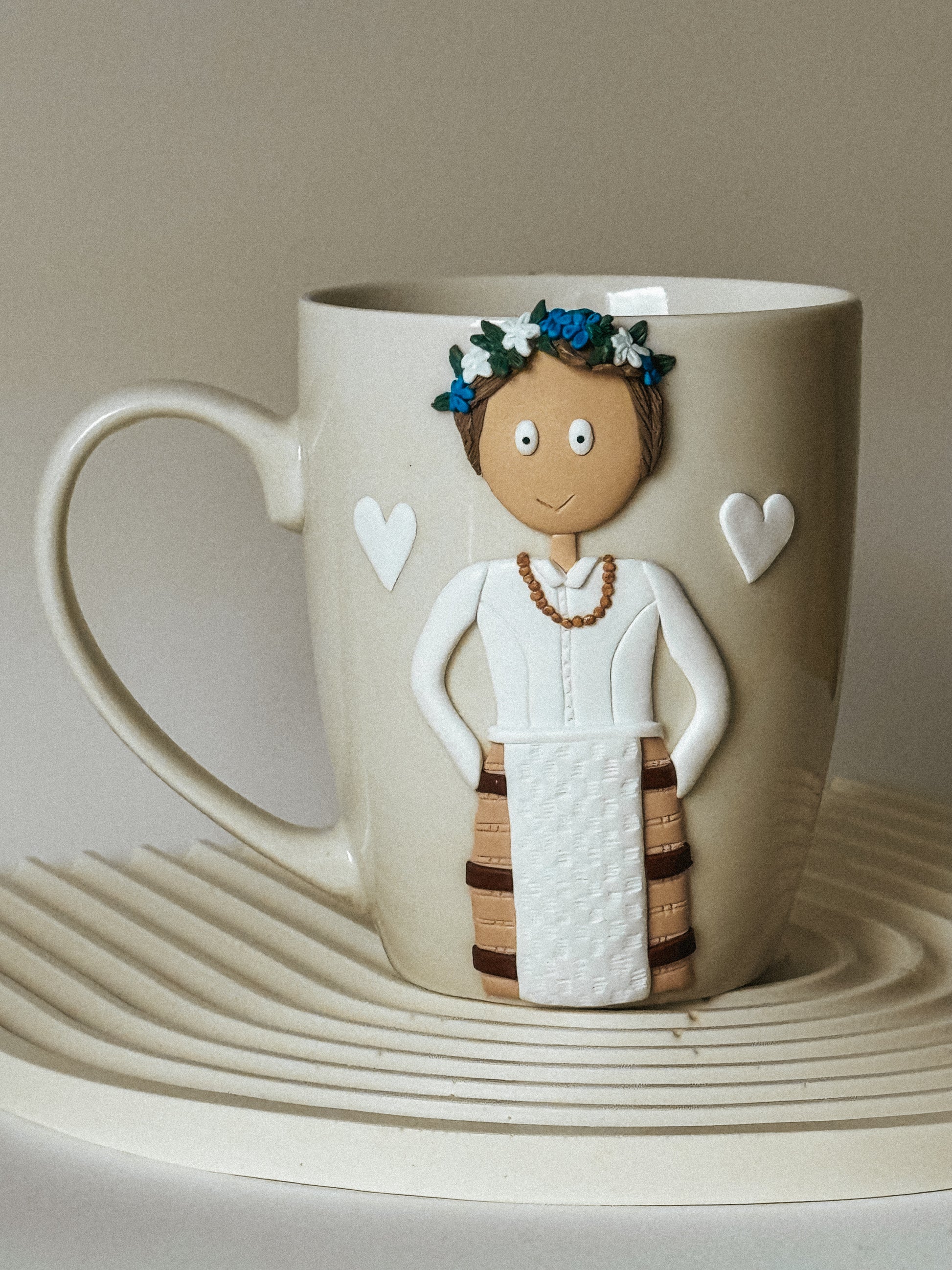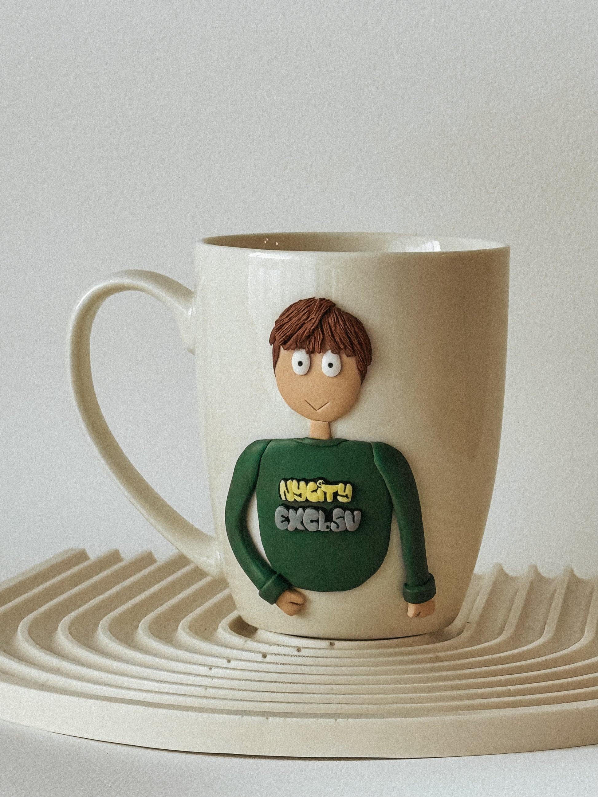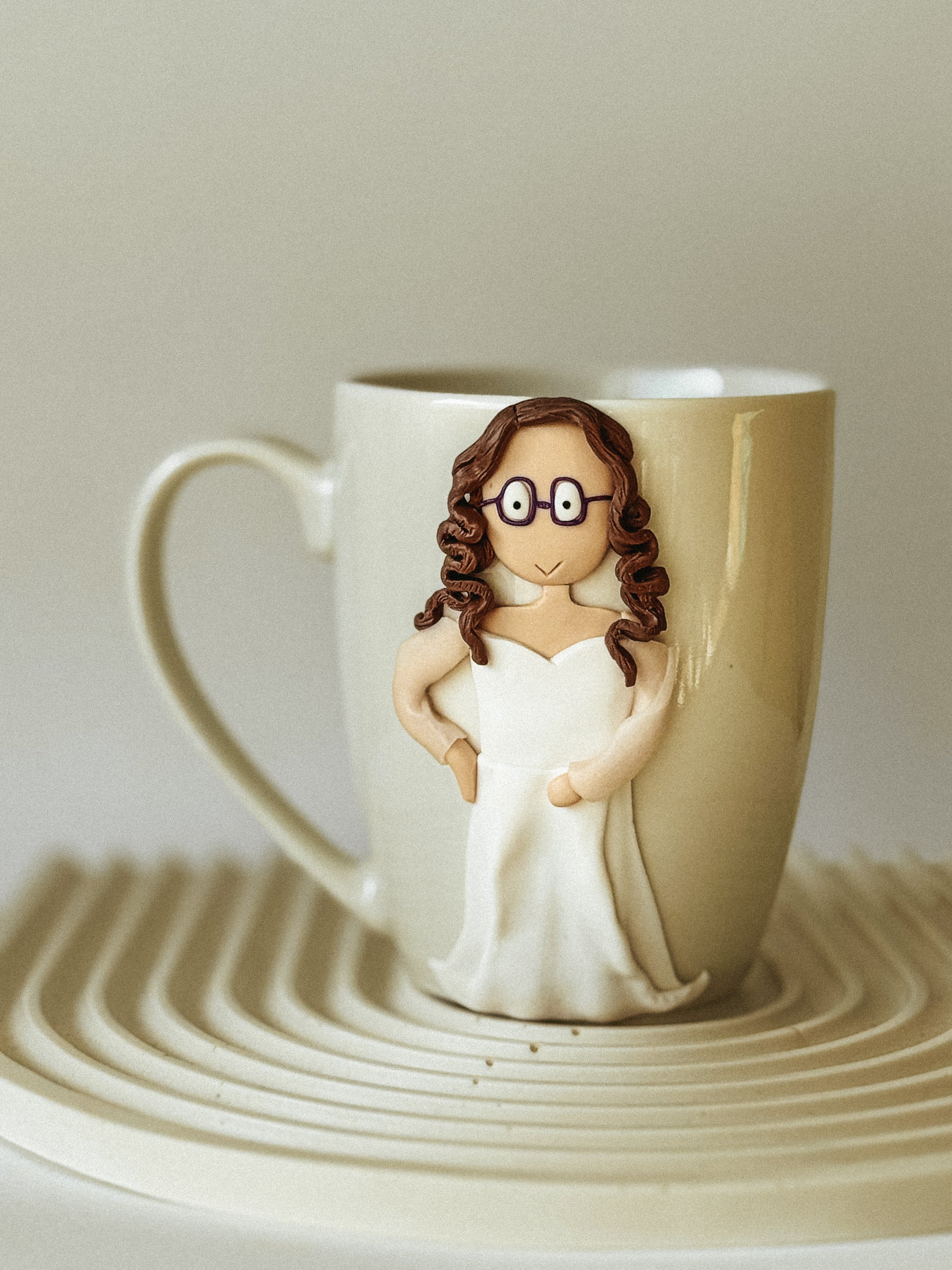 Dekoruotas puodelis pagal individualius užsakymus. Iš polimerinio molio lipdomas ir ant puodelio klijuojamas stilizuotas žmogaus atvaizdas iš atsiųstos nuotraukos. Veido bruožai neatkartojami, tik stiliaus ir aprangos detalės. Puodelį galima naudoti buityje, pilti karštą ar šaltą vandenį. Plauti rankomis, negalima dėti į indaplovę.