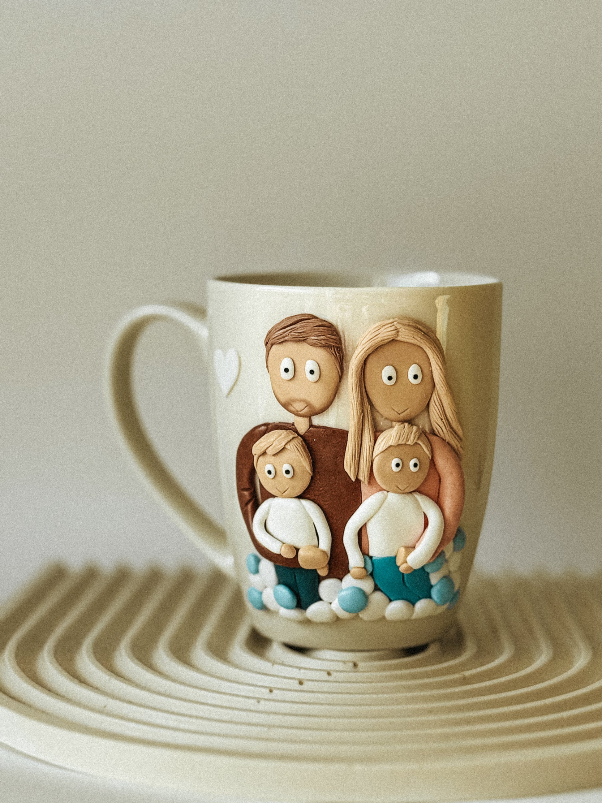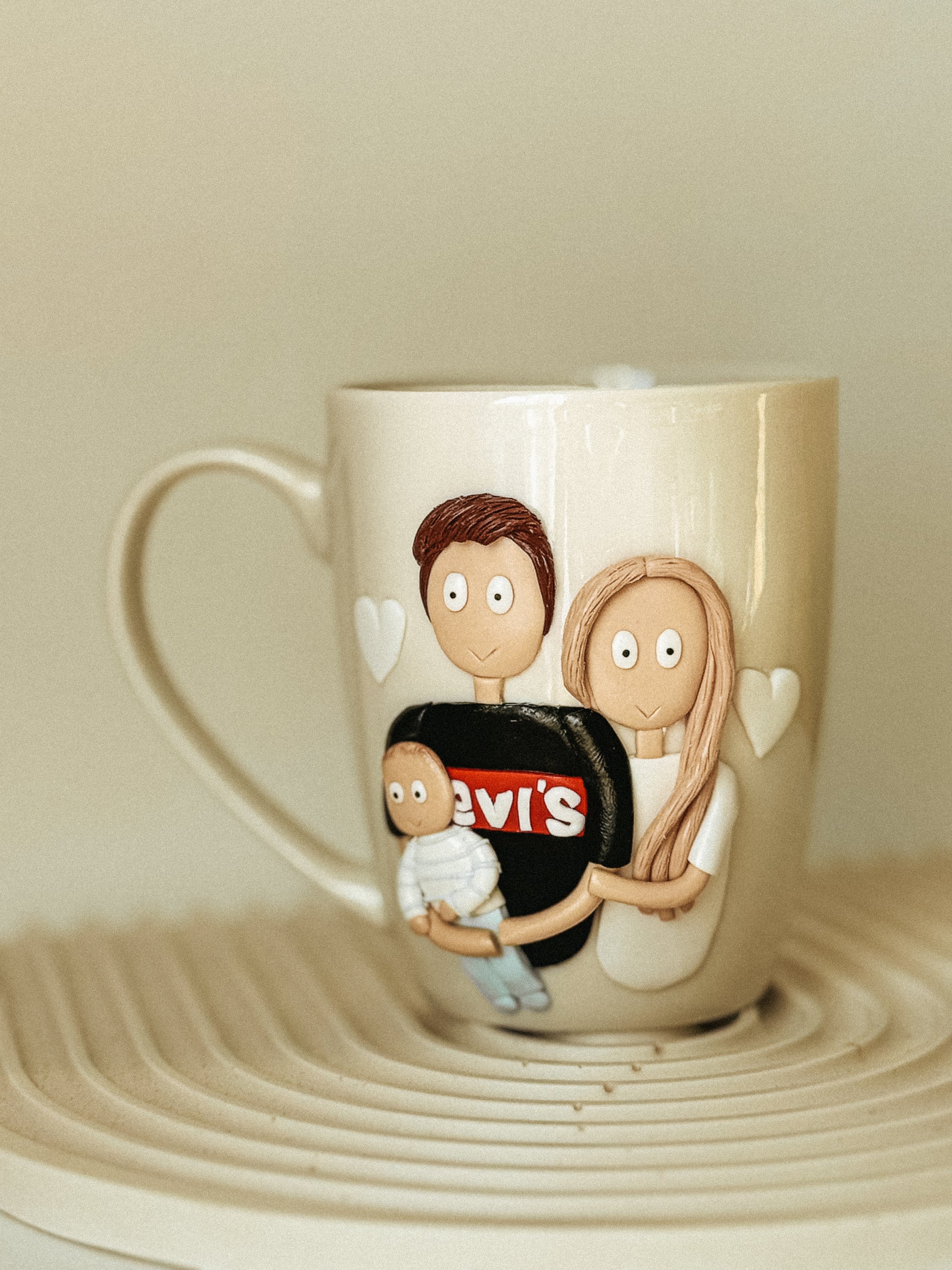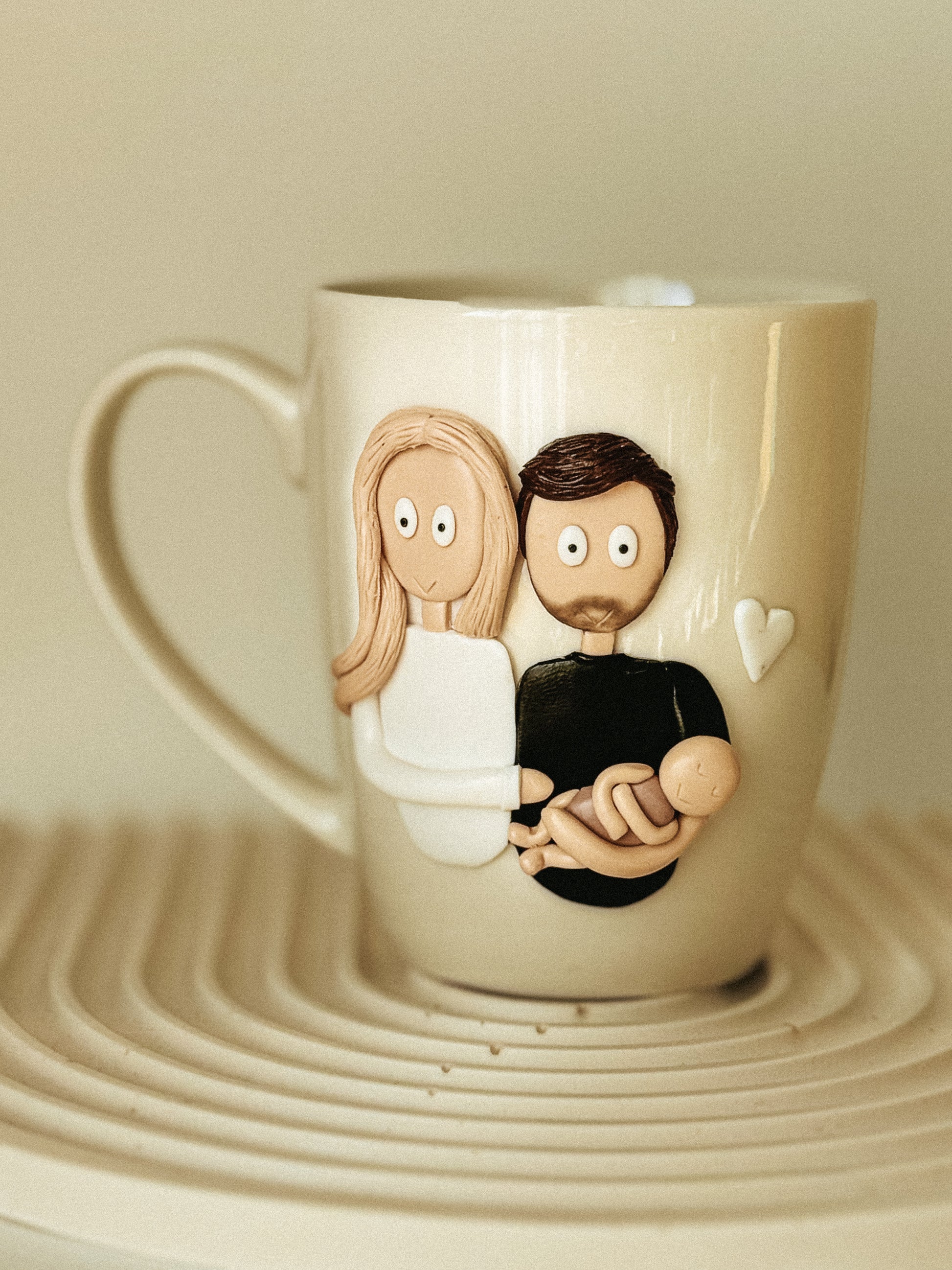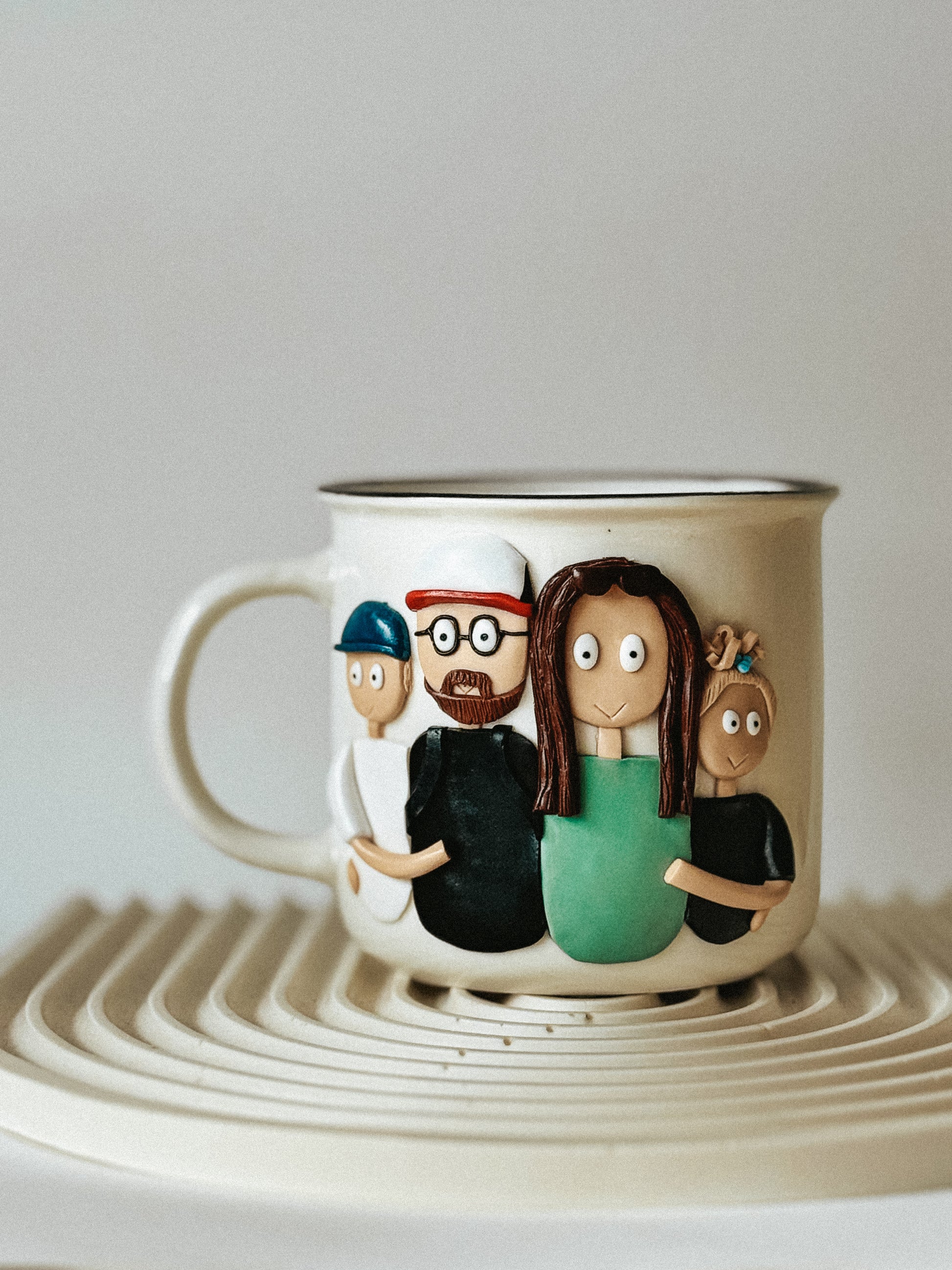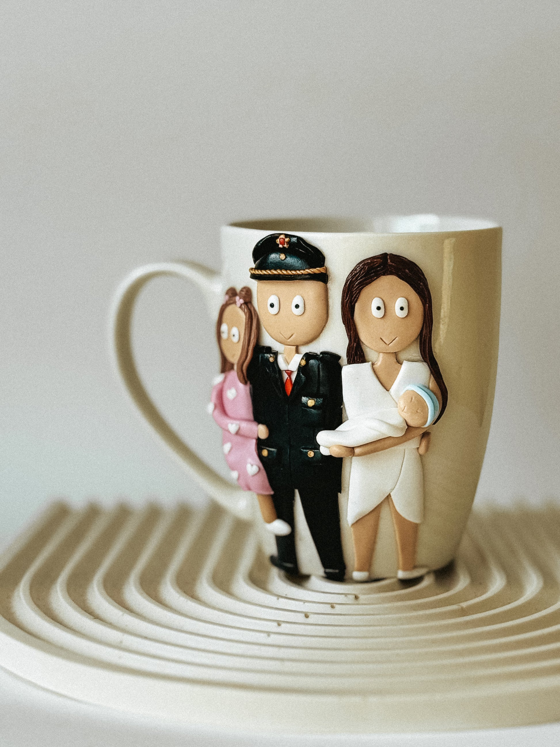Dekoruotas puodelis pagal individualius užsakymus. Iš polimerinio molio lipdomas ir ant puodelio klijuojamas stilizuotas žmogaus atvaizdas iš atsiųstos nuotraukos. Veido bruožai neatkartojami, tik stiliaus ir aprangos detalės. Puodelį galima naudoti buityje, pilti karštą ar šaltą vandenį. Plauti rankomis, negalima dėti į indaplovę.