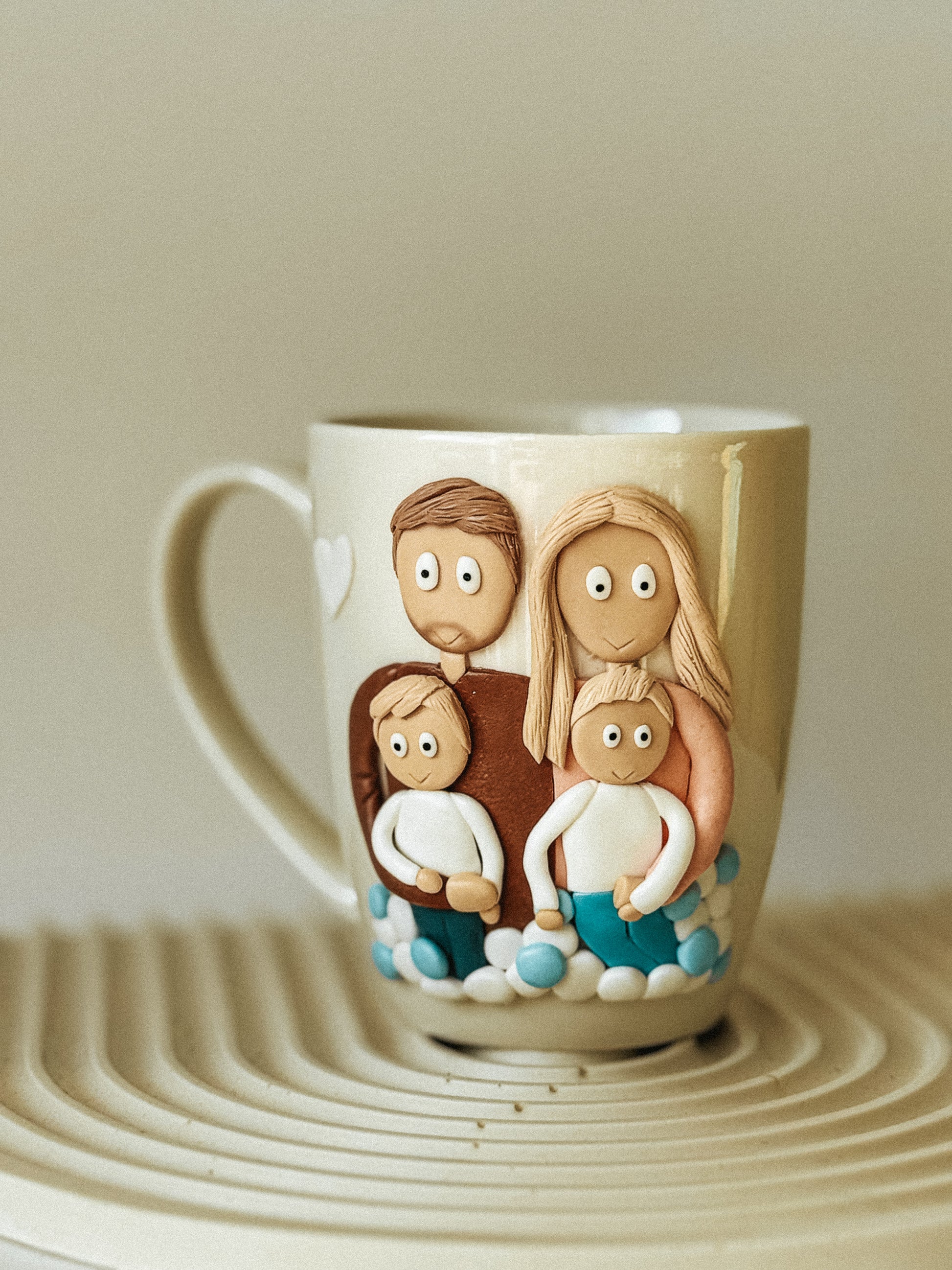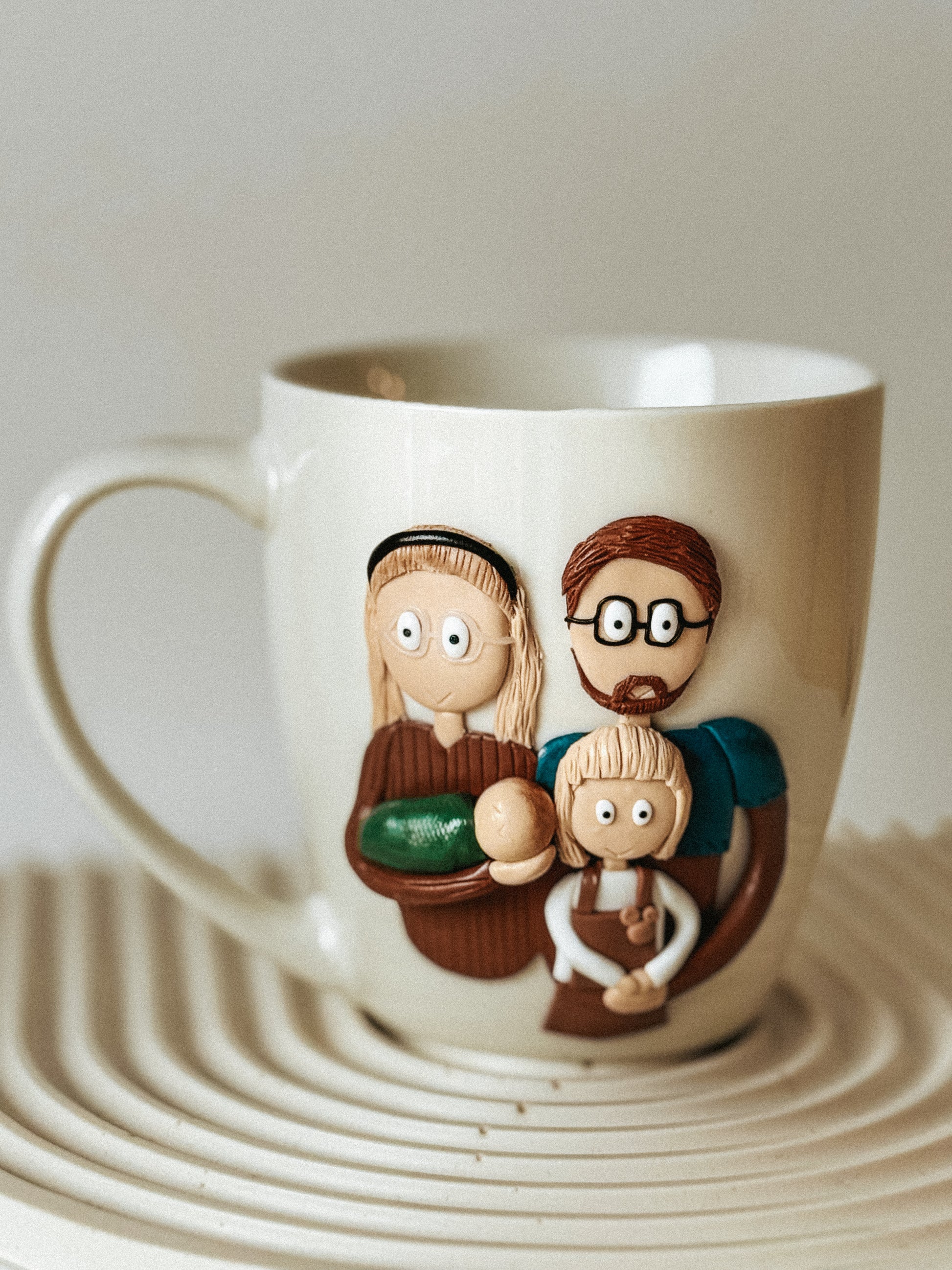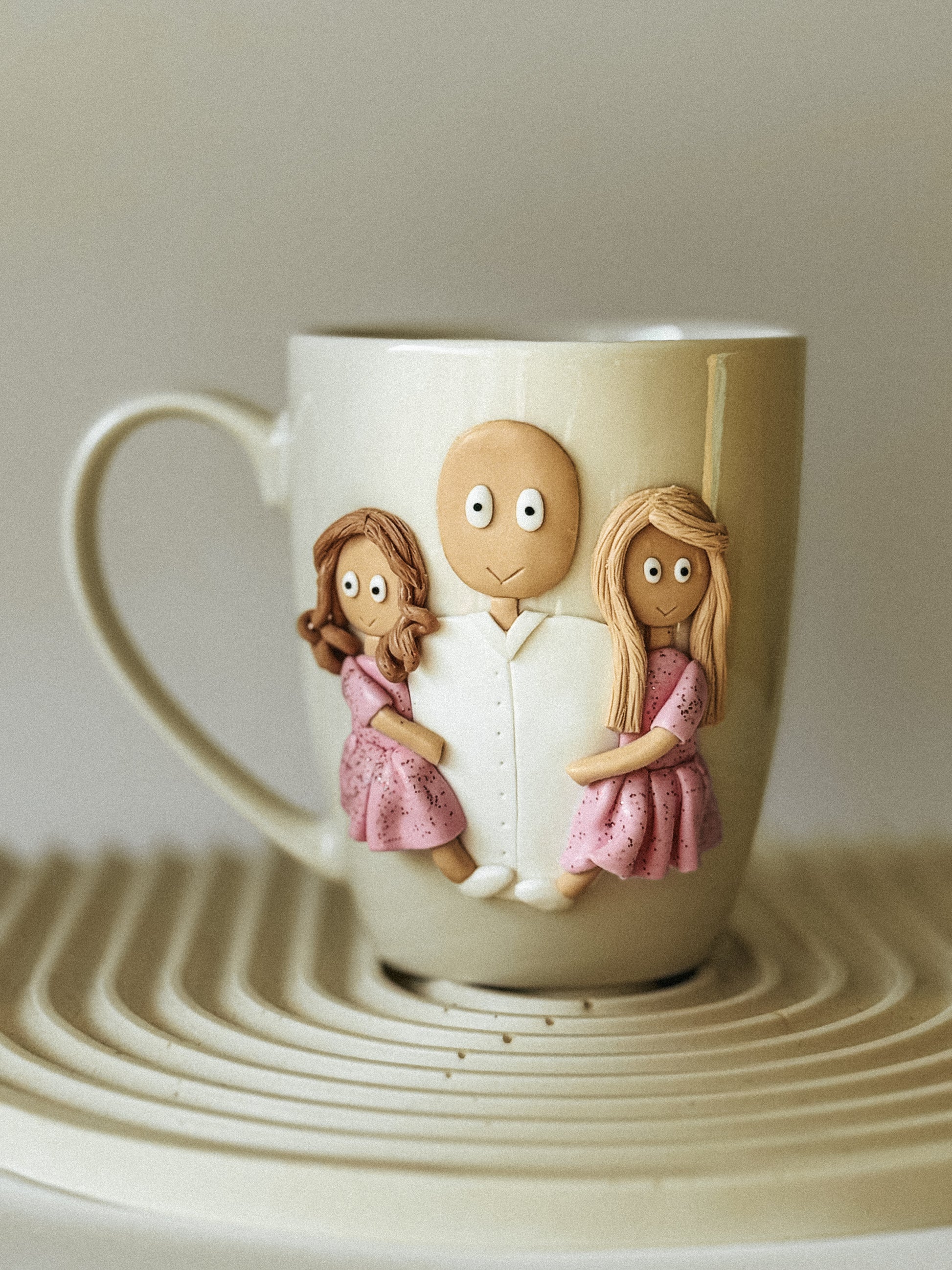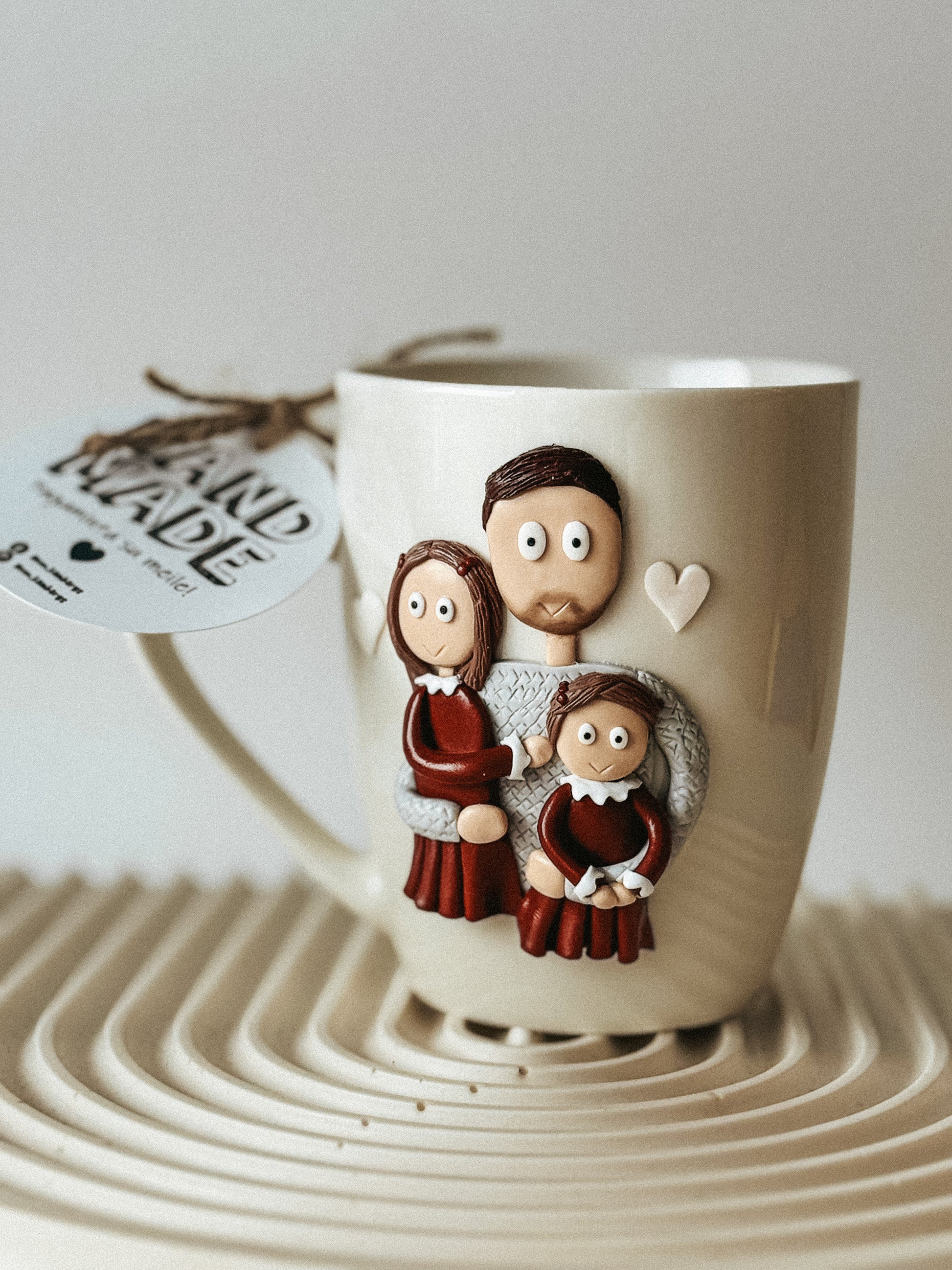Dekoruotas puodelis pagal individualius užsakymus. Iš polimerinio molio lipdomas ir ant puodelio klijuojamas stilizuotas žmogaus atvaizdas iš atsiųstos nuotraukos. Veido bruožai neatkartojami, tik stiliaus ir aprangos detalės. Puodelį galima naudoti buityje, pilti karštą ar šaltą vandenį. Plauti rankomis, negalima dėti į indaplovę.