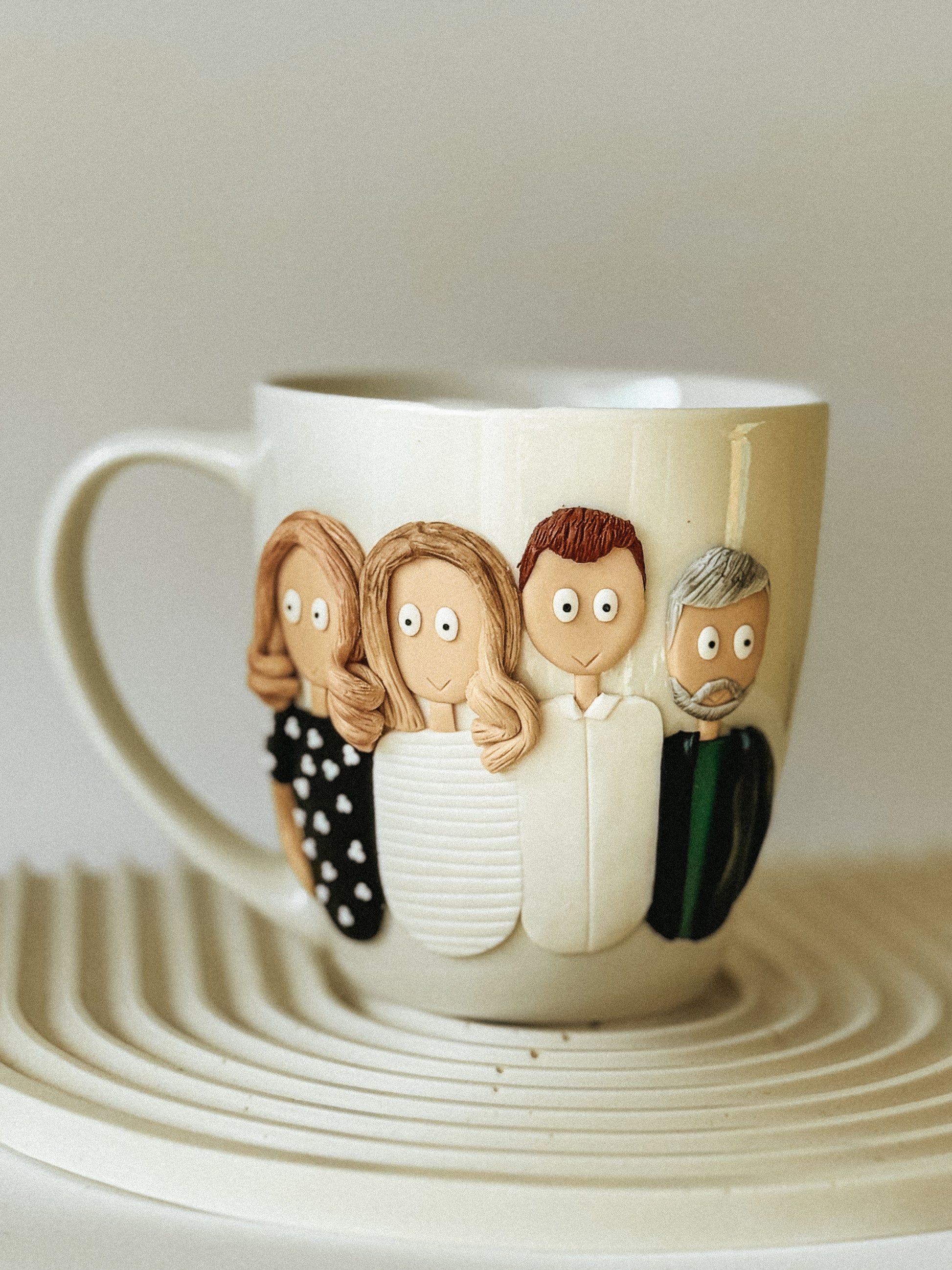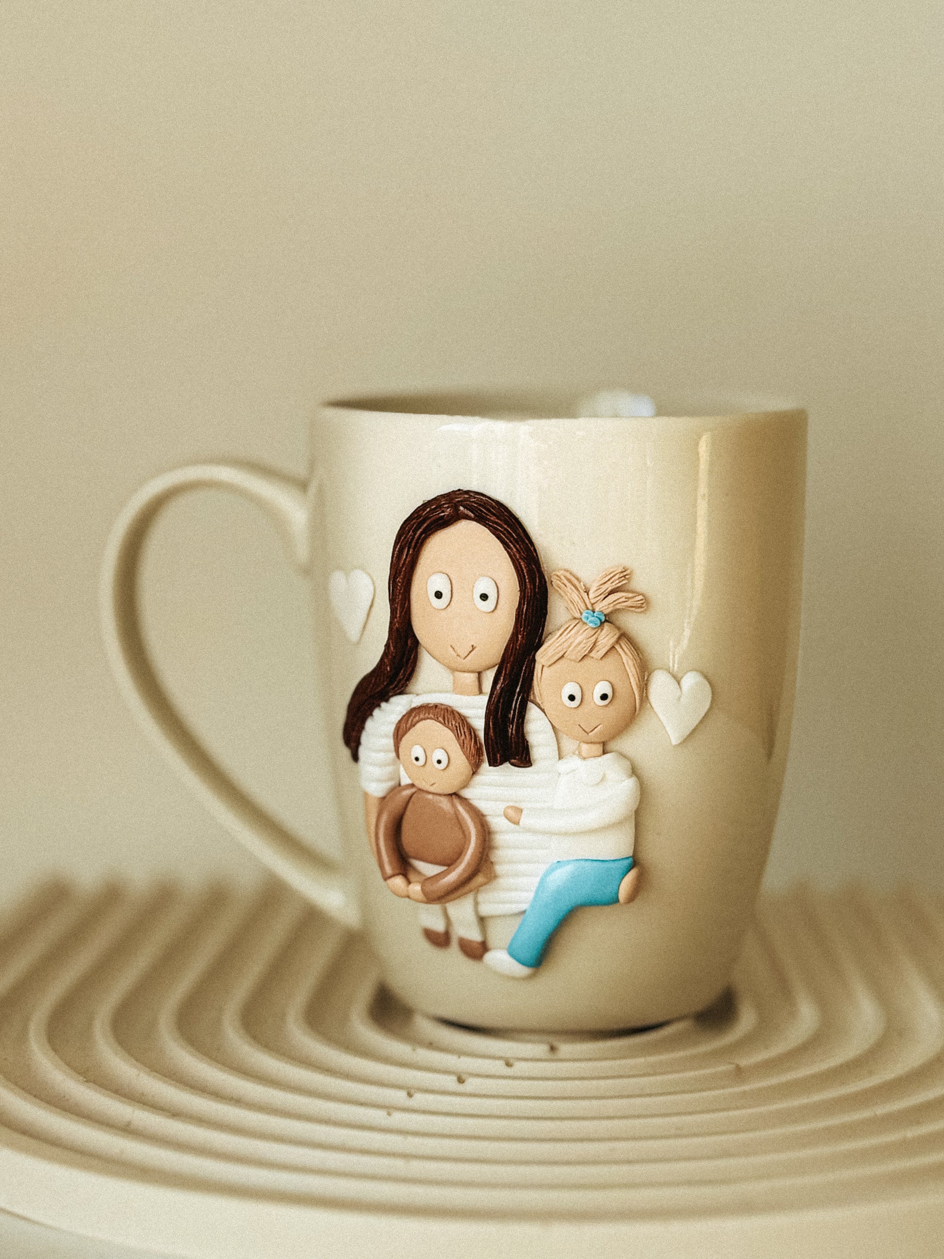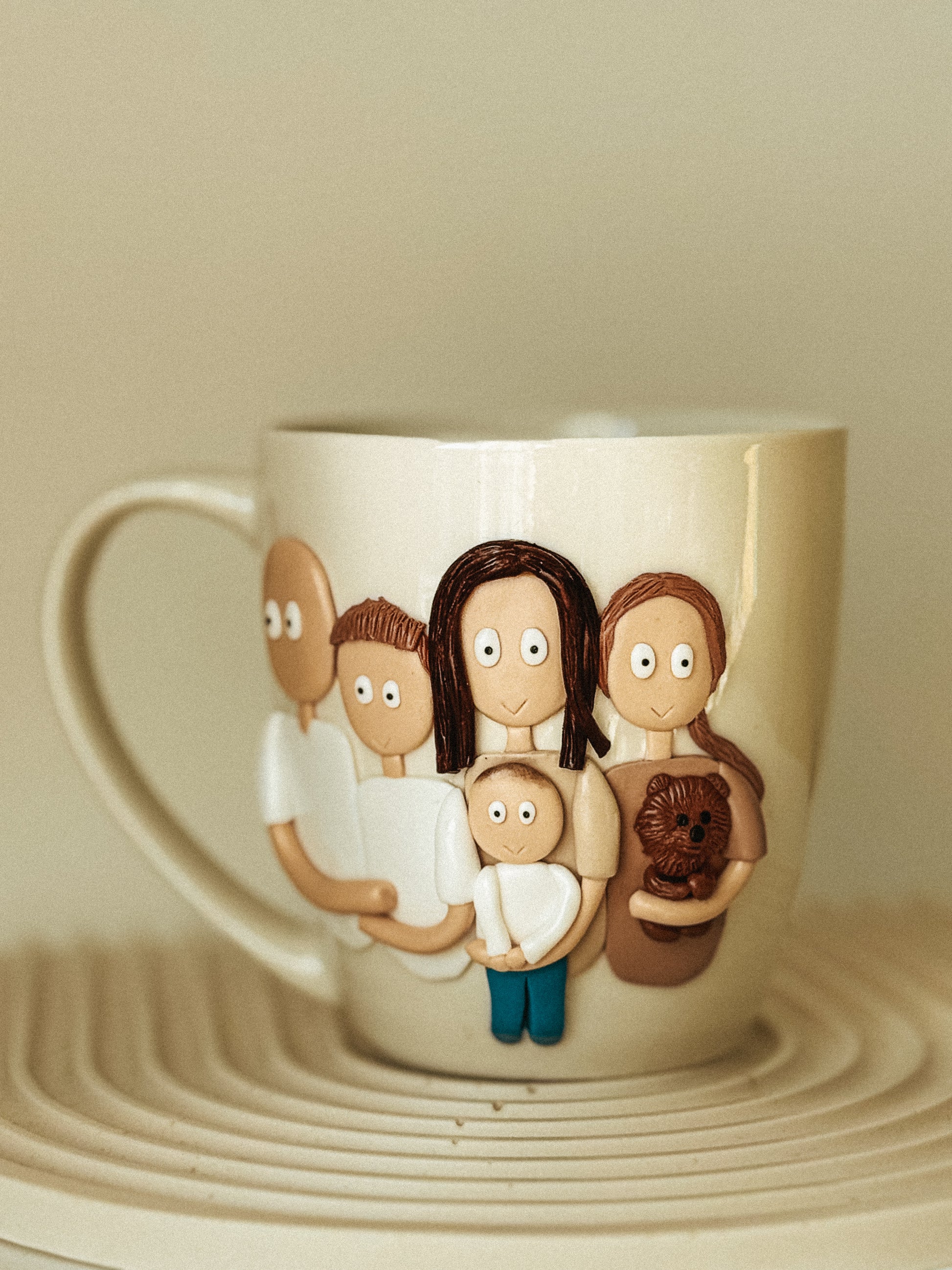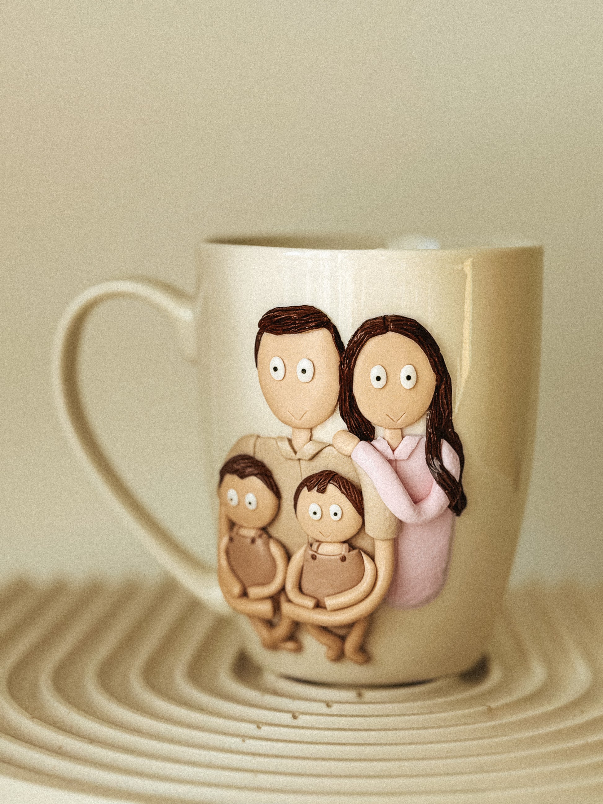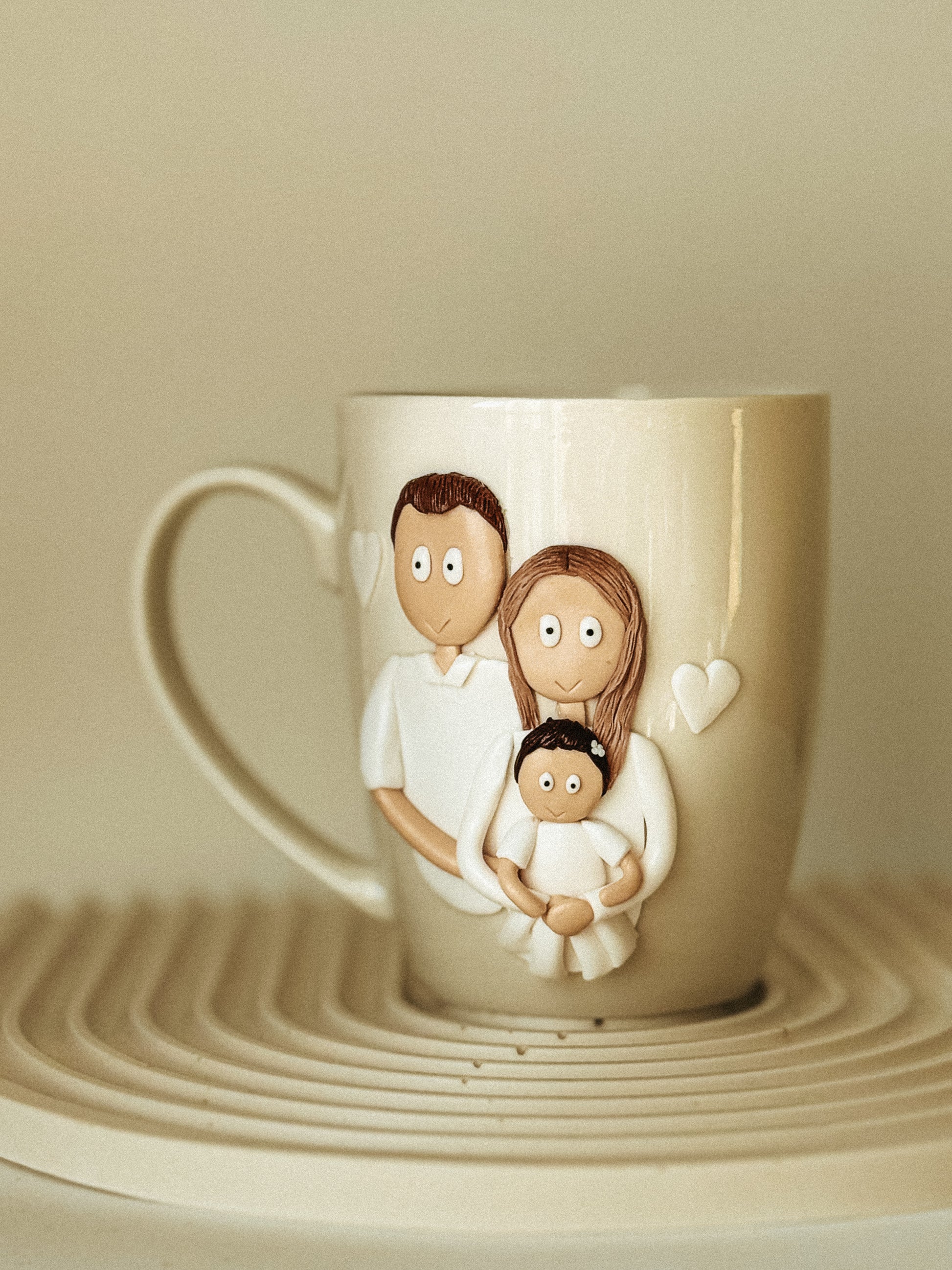 Dekoruotas puodelis pagal individualius užsakymus. Iš polimerinio molio lipdomas ir ant puodelio klijuojamas stilizuotas žmogaus atvaizdas iš atsiųstos nuotraukos. Veido bruožai neatkartojami, tik stiliaus ir aprangos detalės. Puodelį galima naudoti buityje, pilti karštą ar šaltą vandenį. Plauti rankomis, negalima dėti į indaplovę.